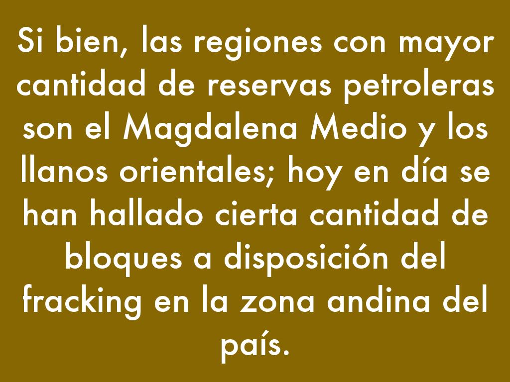 Si bien, las regiones con mayor cantidad de reservas petroleras son el Magdalena Medio y los llanos orientales; hoy en día se han hallado cierta cantidad de bloques a disposición del fracking en la zona andina del país.
