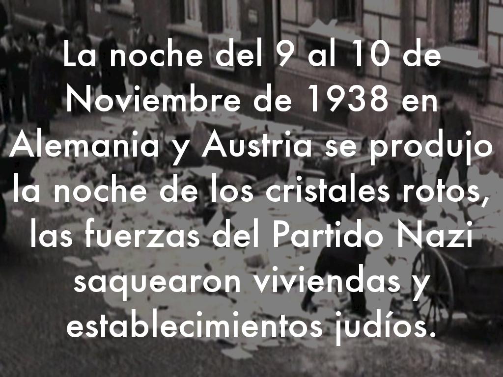 La noche del 9 al 10 de Noviembre de 1938 en Alemania y Austria se produjo la noche de los cristales rotos, las fuerzas del Partido Nazi saquearon viviendas y establecimientos judíos.