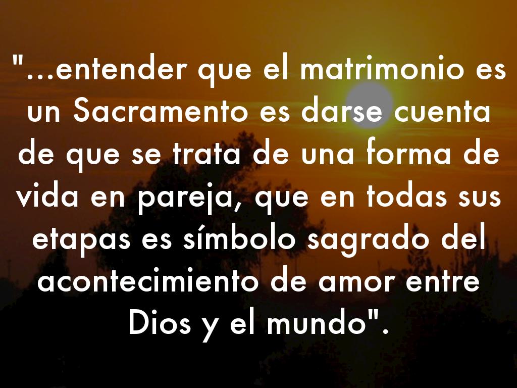 "...entender que el matrimonio es un Sacramento es darse cuenta de que se trata de una forma de vida en pareja, que en todas sus etapas es símbolo sagrado del acontecimiento de amor entre Dios y el mundo".