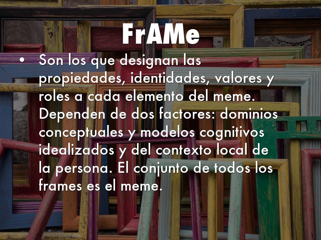 • Son los que designan las propiedades, identidades, valores y roles a cada elemento del meme. Dependen de dos factores: dominios conceptuales y modelos cognitivos idealizados y del contexto local de la persona. El conjunto de todos los frames es el meme.
