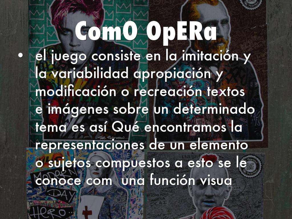 • el juego consiste en la imitación y la variabilidad apropiación y modificación o recreación textos e imágenes sobre un determinado tema es así Qué encontramos la representaciones de un elemento o sujetos compuestos a esto se le conoce com una función visua