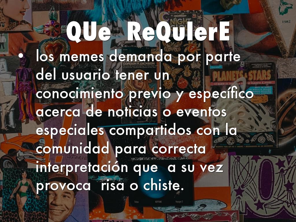 • los memes demanda por parte del usuario tener un conocimiento previo y específico acerca de noticias o eventos especiales compartidos con la comunidad para correcta interpretación que a su vez provoca risa o chiste.