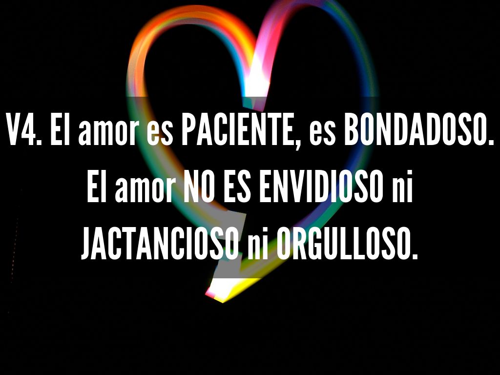 V4. El amor es PACIENTE, es BONDADOSO. El amor NO ES ENVIDIOSO ni JACTANCIOSO ni ORGULLOSO.