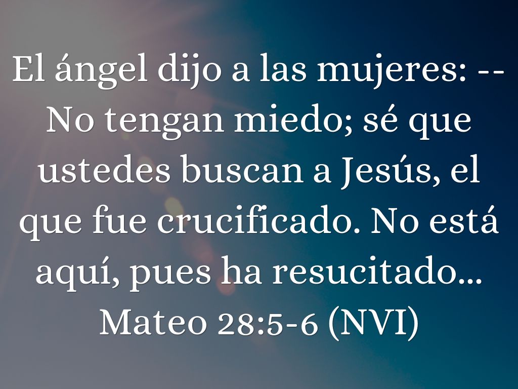 El ángel dijo a las mujeres: --No tengan miedo; sé que ustedes buscan a Jesús, el que fue crucificado. No está aquí, pues ha resucitado... Mateo 28:5-6 (NVI)
