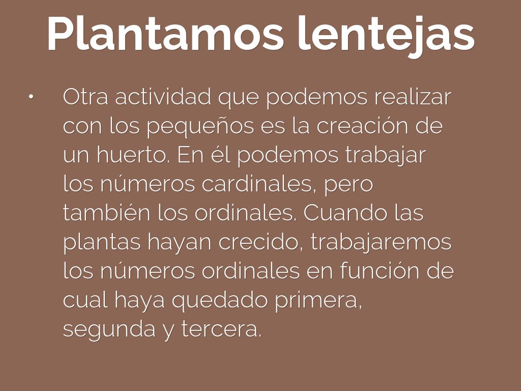 - Otra actividad que podemos realizar con los pequeños es la creación de un huerto. En él podemos trabajar los números cardinales, pero también los ordinales. Cuando las plantas hayan crecido, trabajaremos los números ordinales en función de cual haya quedado primera, segunda y tercera.