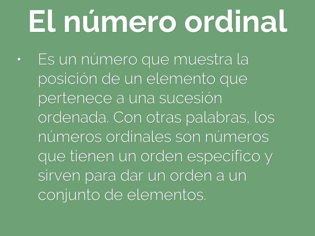 - Es un número que muestra la posición de un elemento que pertenece a una sucesión ordenada. Con otras palabras, los números ordinales son números que tienen un orden específico y sirven para dar un orden a un conjunto de elementos.