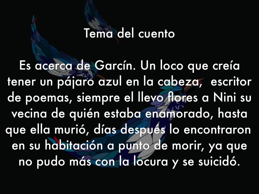 Es acerca de Garcín. Un loco que creía tener un pájaro azul en la cabeza, escritor de poemas, siempre el llevo flores a Nini su vecina de quién estaba enamorado, hasta que ella murió, días después lo encontraron en su habitación a punto de morir, ya que no pudo más con la locura y se suicidó.
