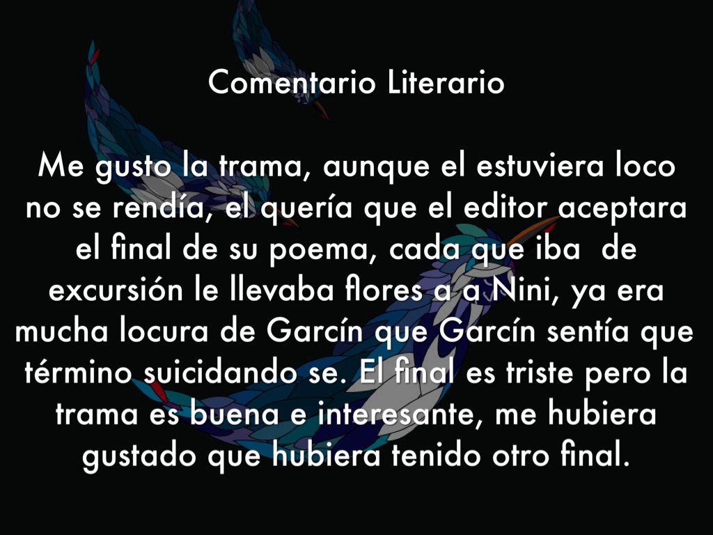 Me gusto la trama, aunque el estuviera loco no se rendía, el quería que el editor aceptara el final de su poema, cada que iba de excursión le llevaba flores a a Nini, ya era mucha locura de Garcín que Garcín sentía que término suicidando se. El final es triste pero la trama es buena e interesante, me hubiera gustado que hubiera tenido otro final.