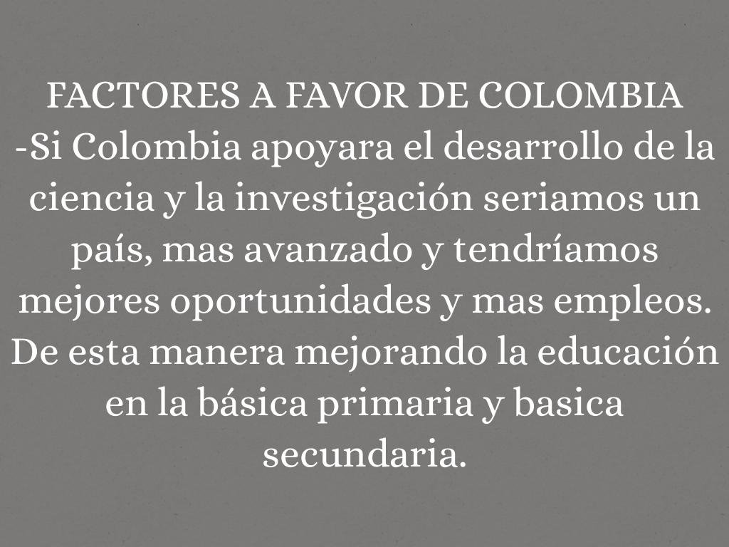 -Si Colombia apoyara el desarrollo de la ciencia y la investigación seriamos un país, mas avanzado y tendríamos mejores oportunidades y mas empleos. De esta manera mejorando la educación en la básica primaria y basica secundaria.