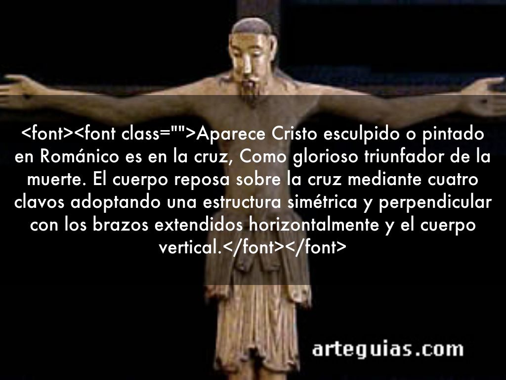 Aparece Cristo esculpido o pintado en Románico es en la cruz, Como glorioso triunfador de la muerte. El cuerpo reposa sobre la cruz mediante cuatro clavos adoptando una estructura simétrica y perpendicular con los brazos extendidos horizontalmente y el cuerpo vertical.