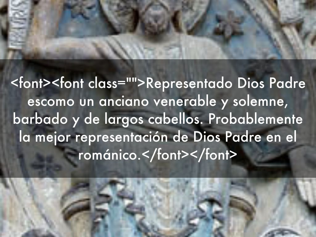 Representado Dios Padre escomo un anciano venerable y solemne, barbado y de largos cabellos. Probablemente la mejor representación de Dios Padre en el románico.