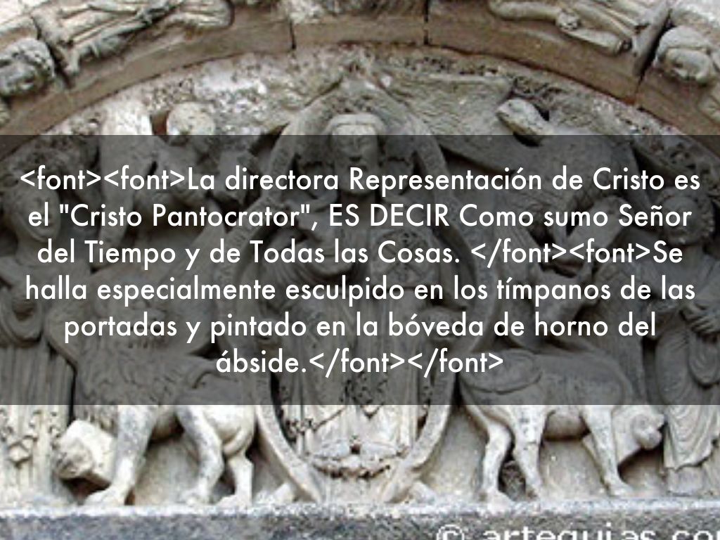 La directora Representación de Cristo es el "Cristo Pantocrator", ES DECIR Como sumo Señor del Tiempo y de Todas las Cosas. Se halla especialmente esculpido en los tímpanos de las portadas y pintado en la bóveda de horno del ábside.