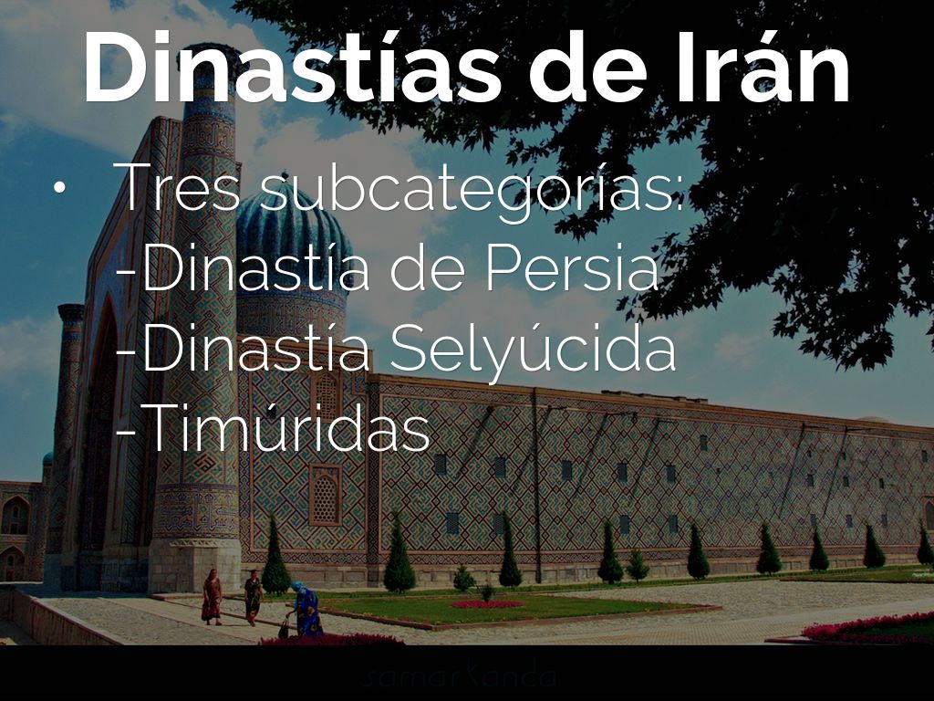 Tres subcategorías: -Dinastía de Persia -Dinastía Selyúcida -Timúridas