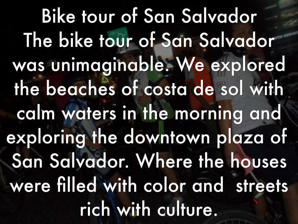 The bike tour of San Salvador was unimaginable. We explored the beaches of costa de sol with calm waters in the morning and exploring the downtown plaza of San Salvador. Where the houses were filled with color and streets rich with culture.