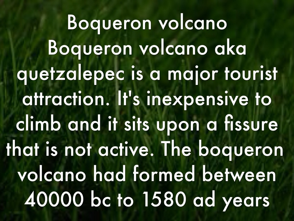 Boqueron volcano aka quetzalepec is a major tourist attraction. It's inexpensive to climb and it sits upon a fissure that is not active. The boqueron volcano had formed between 40000 bc to 1580 ad years