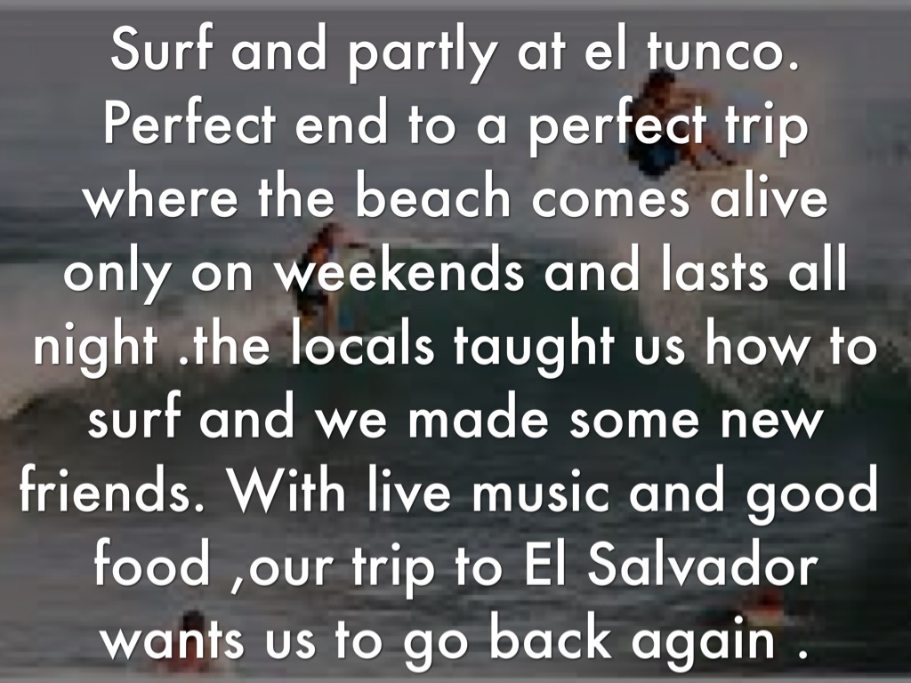 Perfect end to a perfect trip where the beach comes alive only on weekends and lasts all night .the locals taught us how to surf and we made some new friends. With live music and good food ,our trip to El Salvador wants us to go back again .