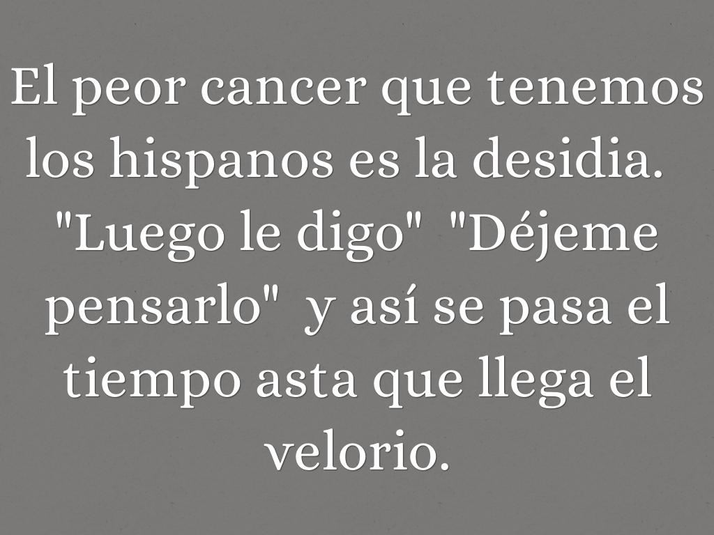 El peor cancer que tenemos los hispanos es la desidia. "Luego le digo" "Déjeme pensarlo" y así se pasa el tiempo asta que llega el velorio.