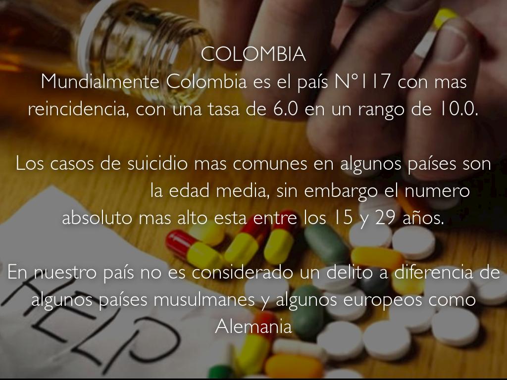 Los casos de suicidio mas comunes en algunos países son la edad media, sin embargo el numero absoluto mas alto esta entre los 15 y 29 años.
