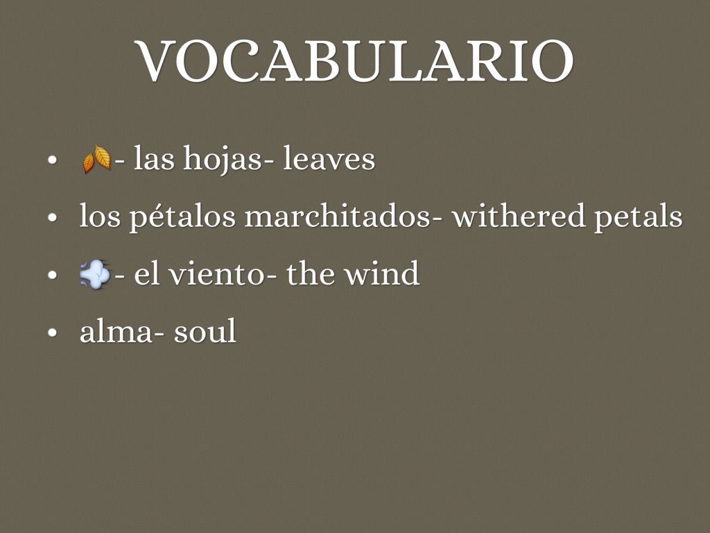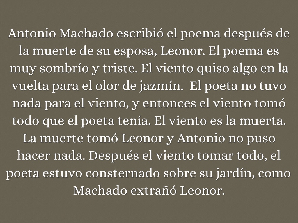 Antonio Machado escribió el poema después de la muerte de su esposa, Leonor. El poema es muy sombrío y triste. El viento quiso algo en la vuelta para el olor de jazmín. El poeta no tuvo nada para el viento, y entonces el viento tomó todo que el poeta tenía. El viento es la muerta. La muerte tomó Leonor y Antonio no puso hacer nada. Después el viento tomar todo, el poeta estuvo consternado sobre su jardín, como Machado extrañó Leonor.