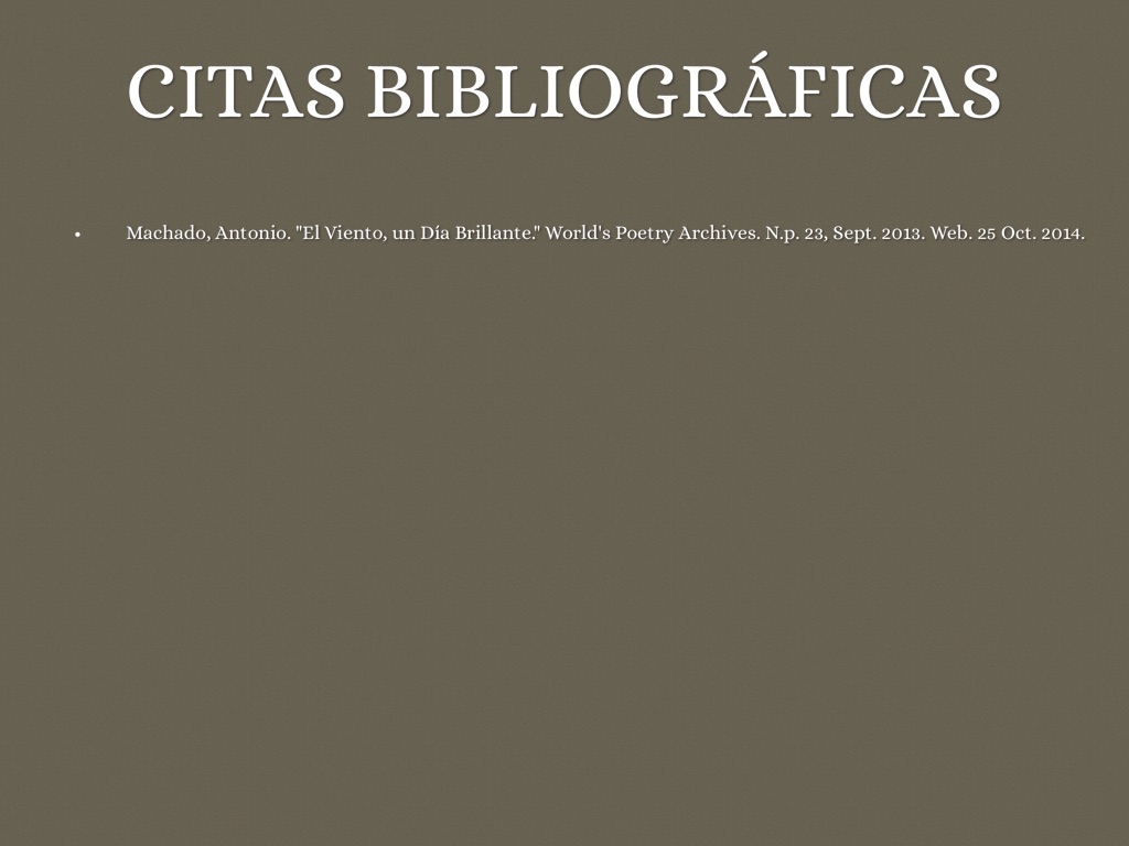 - Machado, Antonio. "El Viento, un Día Brillante." World's Poetry Archives. N.p. 23, Sept. 2013. Web. 25 Oct. 2014.