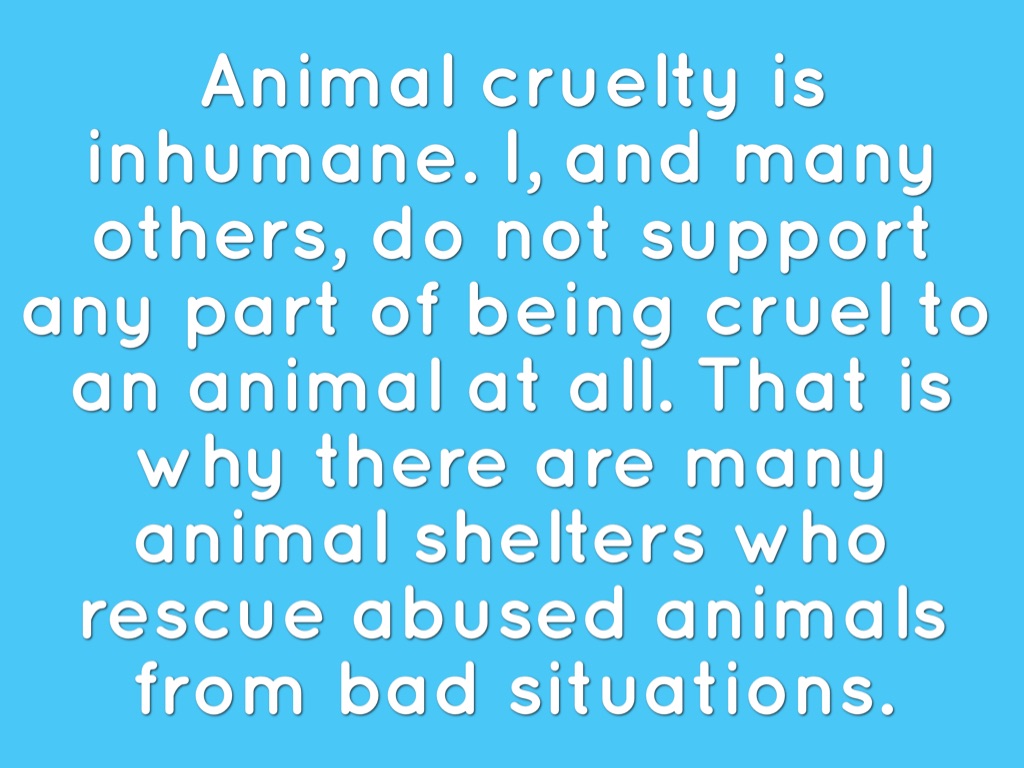 Animal cruelty is inhumane. I, and many others, do not support any part of being cruel to an animal at all. That is why there are many animal shelters who rescue abused animals from bad situations.