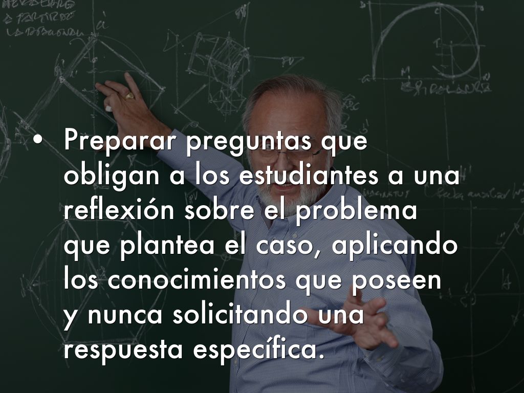 Preparar preguntas que obligan a los estudiantes a una reflexión sobre el problema que plantea el caso, aplicando los conocimientos que poseen y nunca solicitando una respuesta específica.