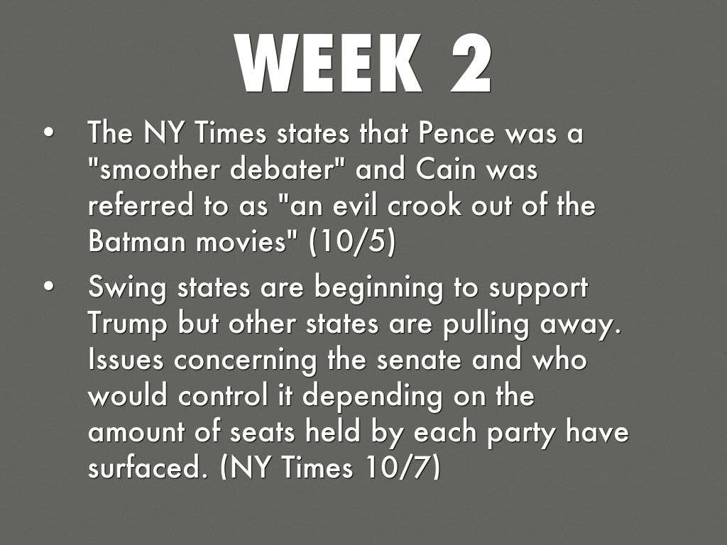• Swing states are beginning to support Trump but other states are pulling away. Issues concerning the senate and who would control it depending on the amount of seats held by each party have surfaced. (NY Times 10/7)