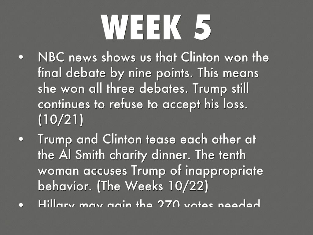 • NBC news shows us that Clinton won the final debate by nine points. This means she won all three debates. Trump still continues to refuse to accept his loss. (10/21)