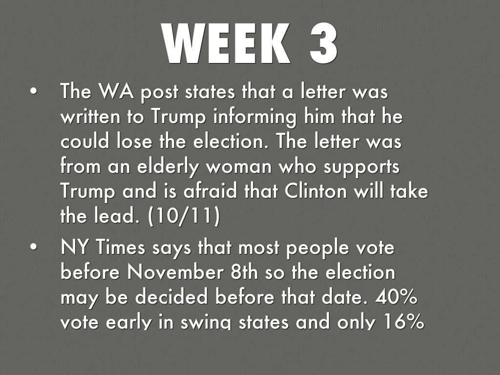 • The WA post states that a letter was written to Trump informing him that he could lose the election. The letter was from an elderly woman who supports Trump and is afraid that Clinton will take the lead. (10/11)