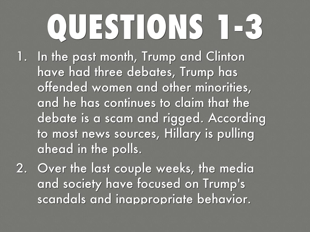 • In the past month, Trump and Clinton have had three debates, Trump has offended women and other minorities, and he has continues to claim that the debate is a scam and rigged. According to most news sources, Hillary is pulling ahead in the polls.