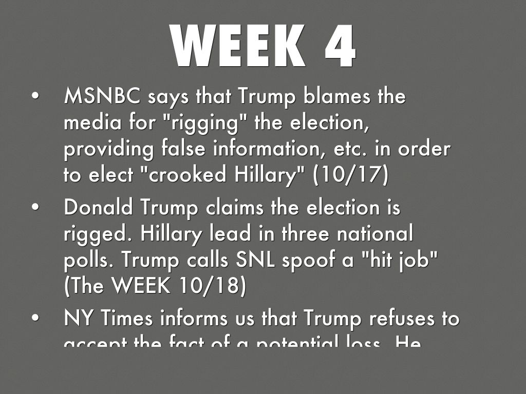 • MSNBC says that Trump blames the media for "rigging" the election, providing false information, etc. in order to elect "crooked Hillary" (10/17)