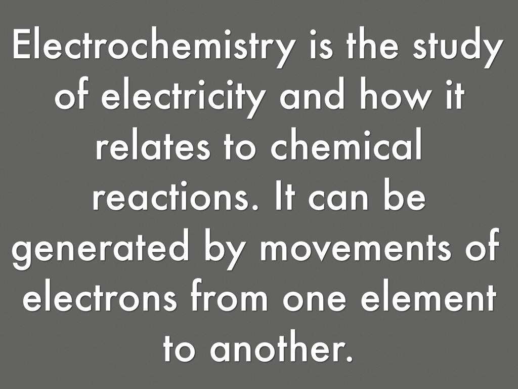 Electrochemistry is the study of electricity and how it relates to chemical reactions. It can be generated by movements of electrons from one element to another.