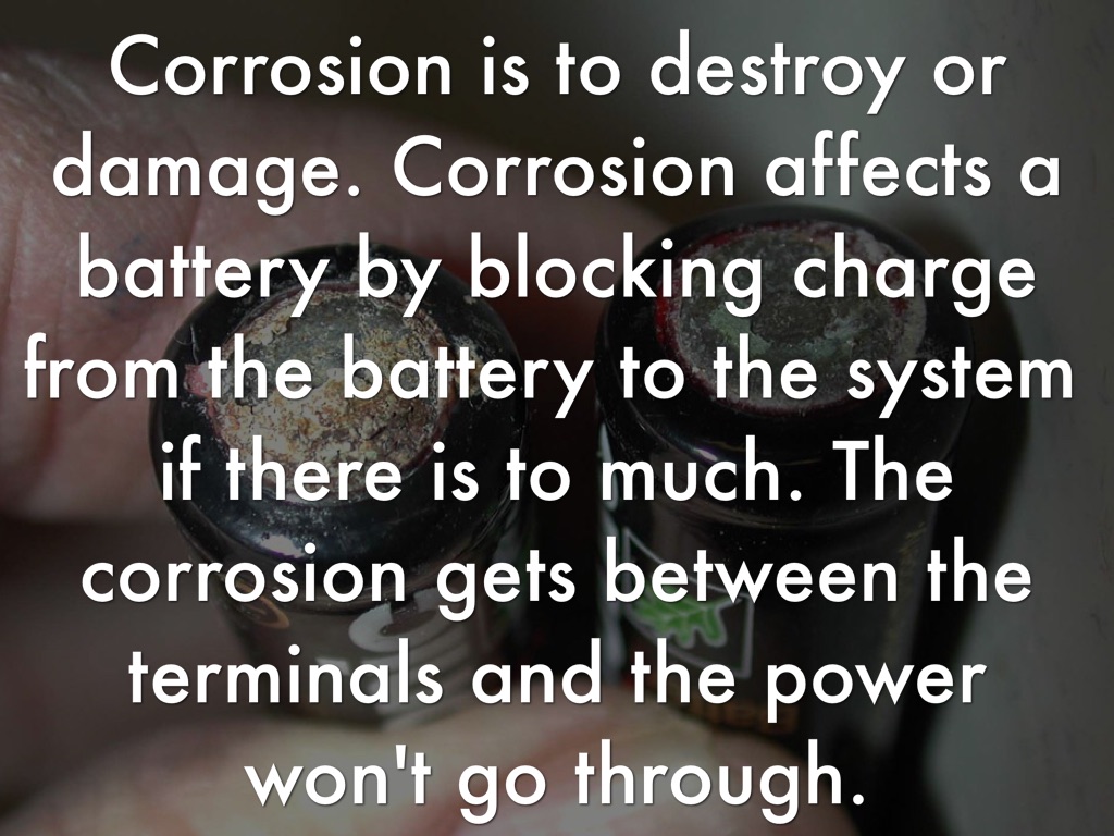 Corrosion is to destroy or damage. Corrosion affects a battery by blocking charge from the battery to the system if there is to much. The corrosion gets between the terminals and the power won't go through.