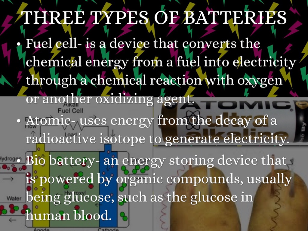 Bio battery- an energy storing device that is powered by organic compounds, usually being glucose, such as the glucose in human blood.
