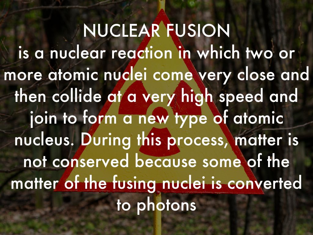 NUCLEAR FUSION is a nuclear reaction in which two or more atomic nuclei come very close and then collide at a very high speed and join to form a new type of atomic nucleus. During this process, matter is not conserved because some of the matter of the fusing nuclei is converted to photons