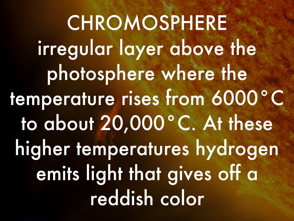 CHROMOSPHERE irregular layer above the photosphere where the temperature rises from 6000°C to about 20,000°C. At these higher temperatures hydrogen emits light that gives off a reddish color