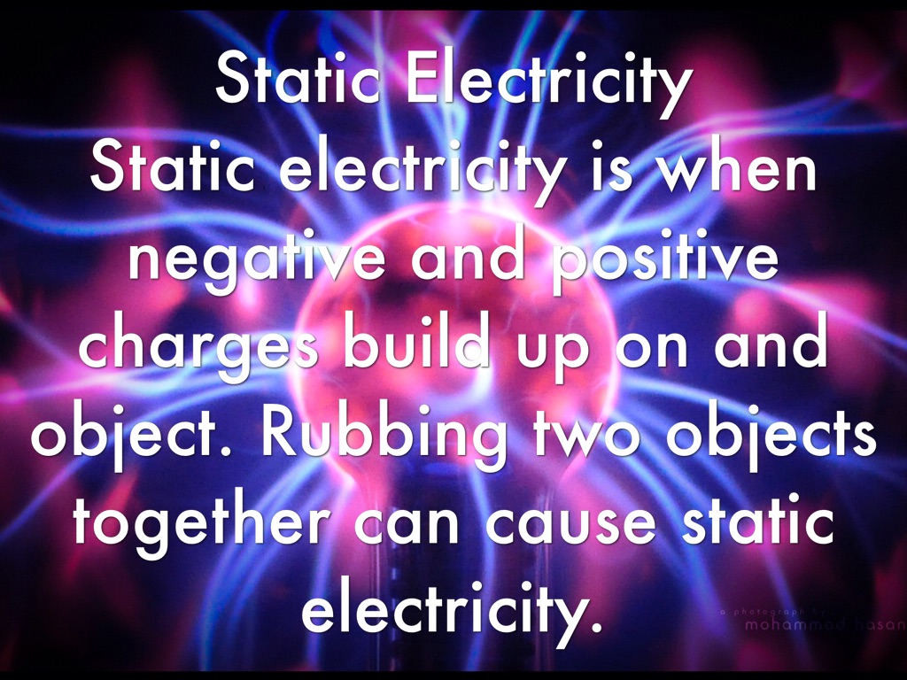 Static electricity is when negative and positive charges build up on and object. Rubbing two objects together can cause static electricity.