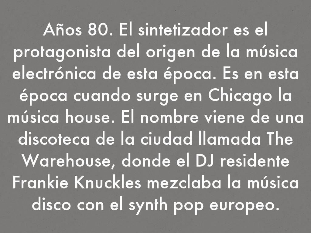 Años 80. El sintetizador es el protagonista del origen de la música electrónica de esta época. Es en esta época cuando surge en Chicago la música house. El nombre viene de una discoteca de la ciudad llamada The Warehouse, donde el DJ residente Frankie Knuckles mezclaba la música disco con el synth pop europeo.