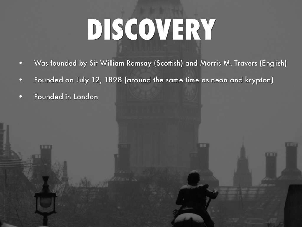 • Founded on July 12, 1898 (around the same time as neon and krypton)