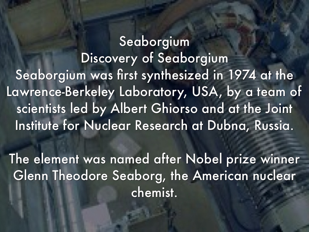 Seaborgium was first synthesized in 1974 at the Lawrence-Berkeley Laboratory, USA, by a team of scientists led by Albert Ghiorso and at the Joint Institute for Nuclear Research at Dubna, Russia.