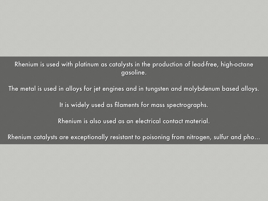 Rhenium is used with platinum as catalysts in the production of lead-free, high-octane gasoline.
