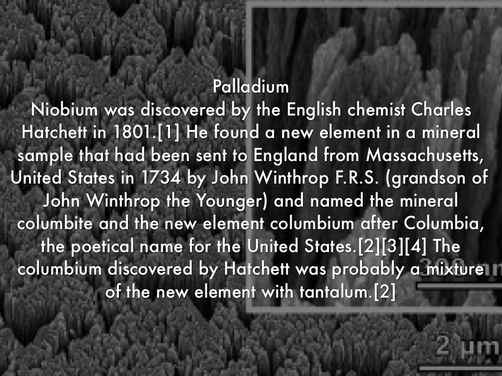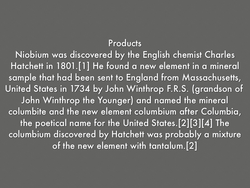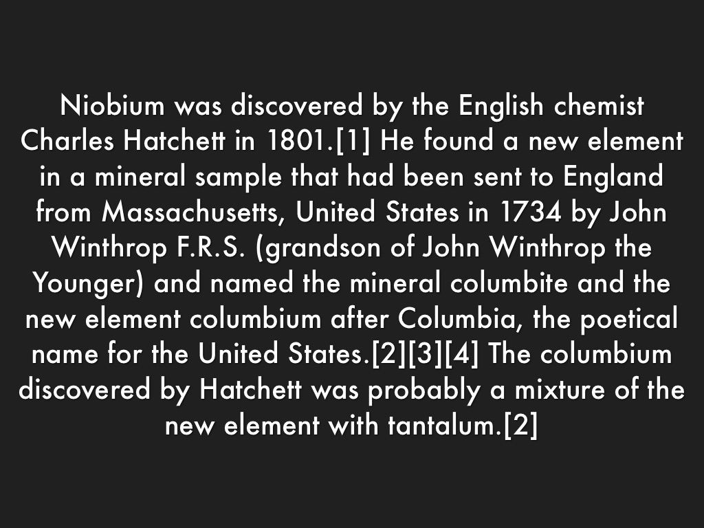 Niobium was discovered by the English chemist Charles Hatchett in 1801.[1] He found a new element in a mineral sample that had been sent to England from Massachusetts, United States in 1734 by John Winthrop F.R.S. (grandson of John Winthrop the Younger) and named the mineral columbite and the new element columbium after Columbia, the poetical name for the United States.[2][3][4] The columbium discovered by Hatchett was probably a mixture of the new element with tantalum.[2]