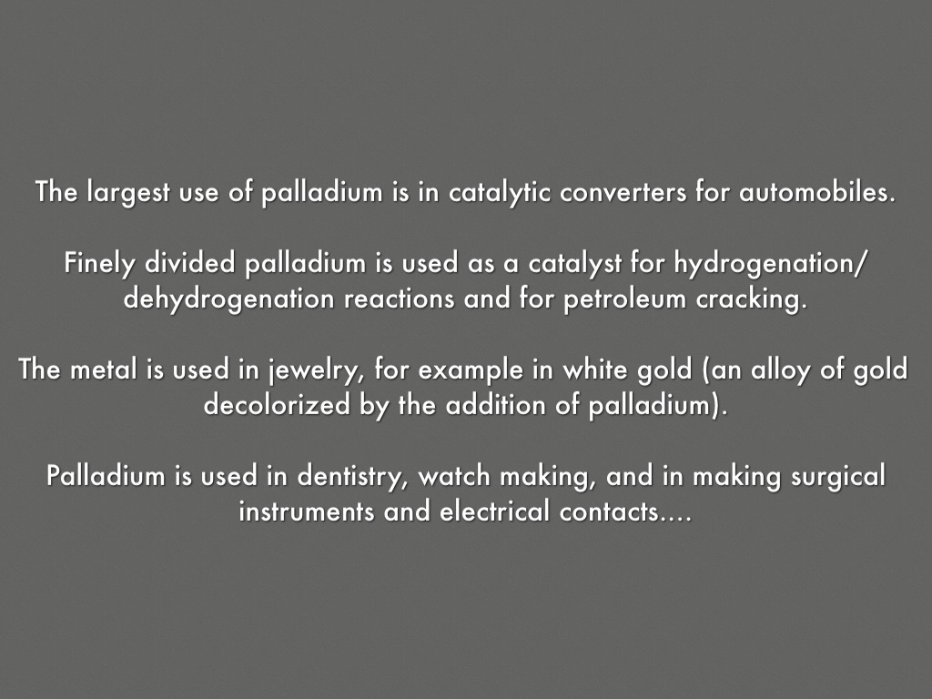 Finely divided palladium is used as a catalyst for hydrogenation/dehydrogenation reactions and for petroleum cracking.