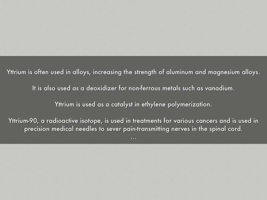 Yttrium is often used in alloys, increasing the strength of aluminum and magnesium alloys.