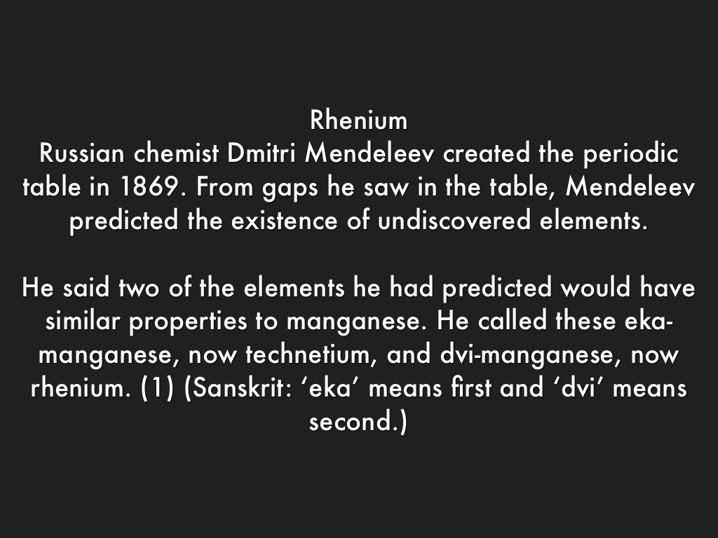 He said two of the elements he had predicted would have similar properties to manganese. He called these eka-manganese, now technetium, and dvi-manganese, now rhenium. (1) (Sanskrit: ‘eka’ means first and ‘dvi’ means second.)