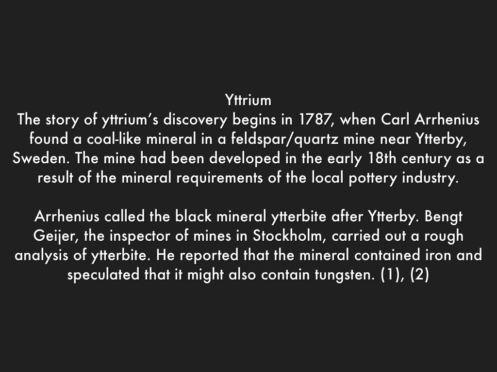 The story of yttrium’s discovery begins in 1787, when Carl Arrhenius found a coal-like mineral in a feldspar/quartz mine near Ytterby, Sweden. The mine had been developed in the early 18th century as a result of the mineral requirements of the local pottery industry.