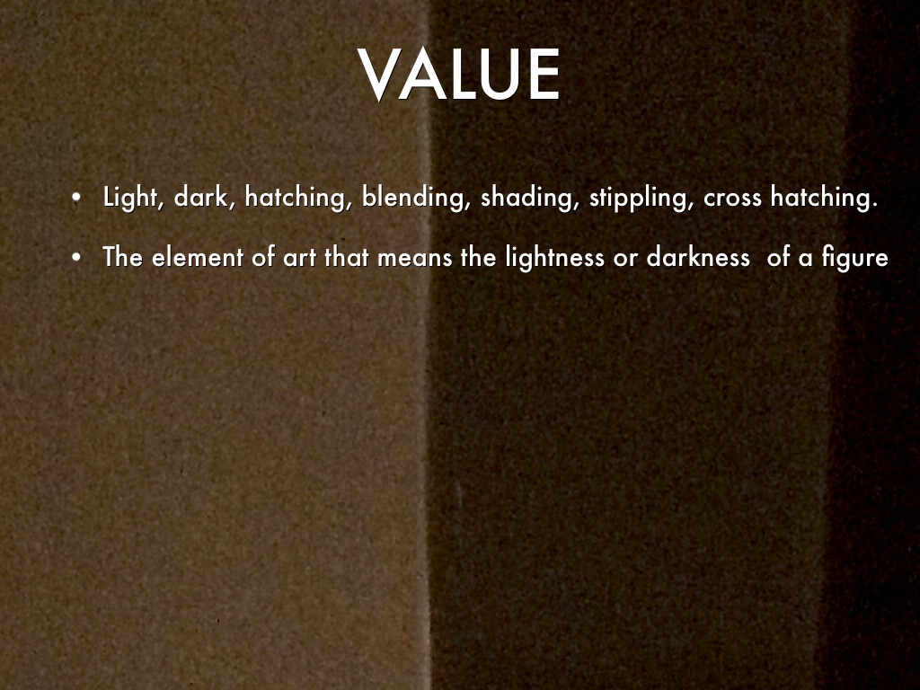 Light, dark, hatching, blending, shading, stippling, cross hatching.