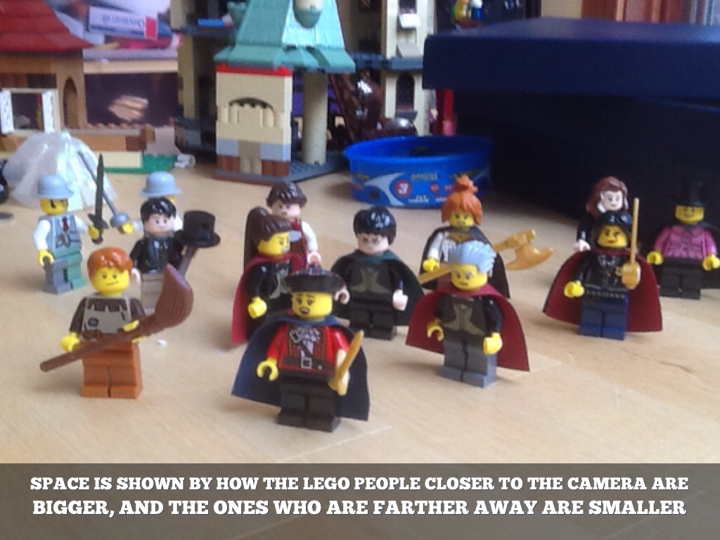 SPACE IS SHOWN BY HOW THE LEGO PEOPLE CLOSER TO THE CAMERA ARE