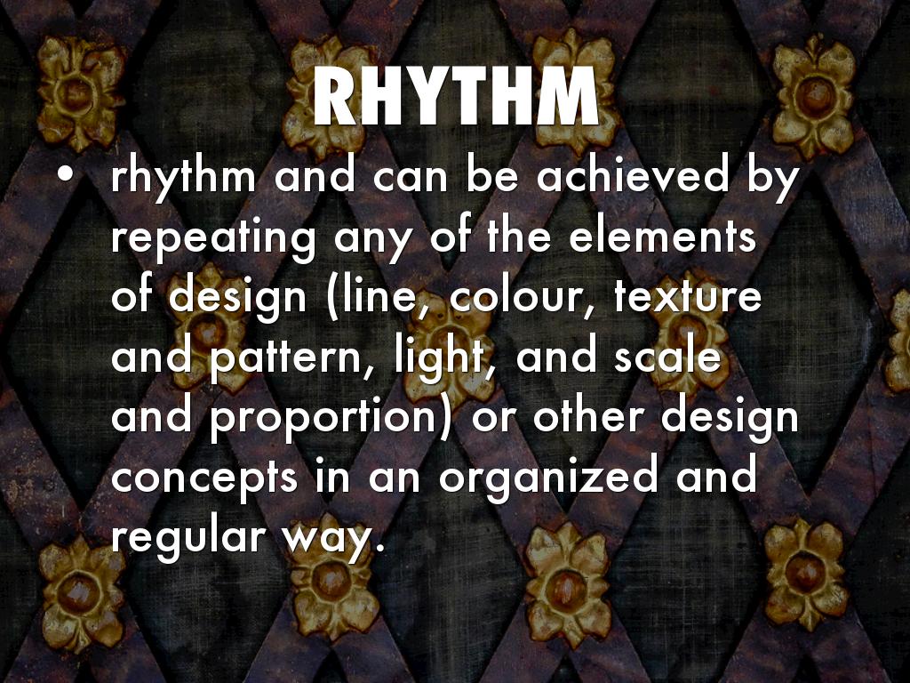 rhythm and can be achieved by repeating any of the elements of design (line, colour, texture and pattern, light, and scale and proportion) or other design concepts in an organized and regular way.