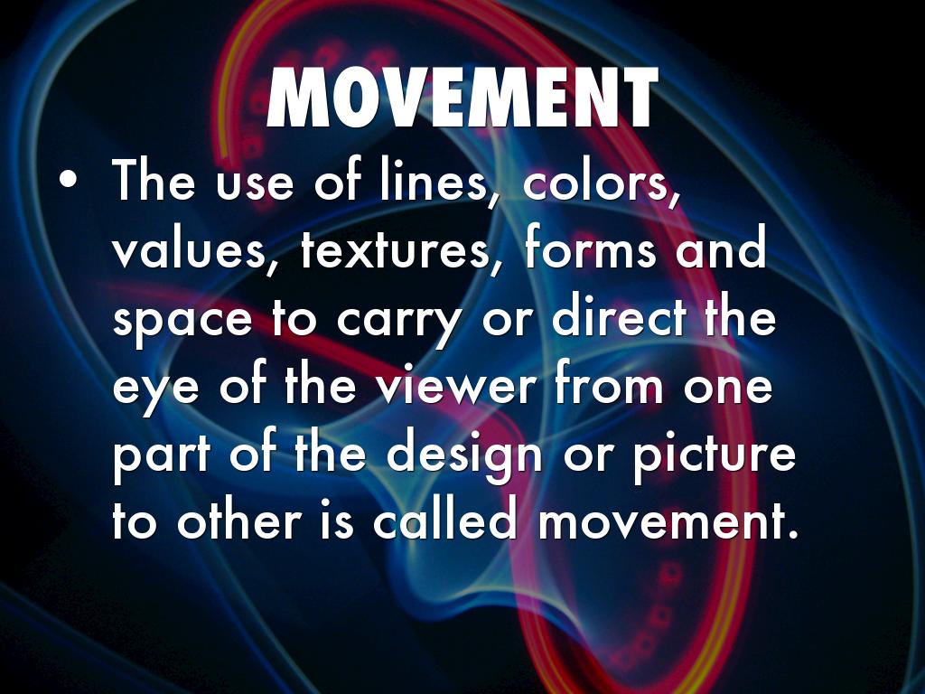The use of lines, colors, values, textures, forms and space to carry or direct the eye of the viewer from one part of the design or picture to other is called movement.